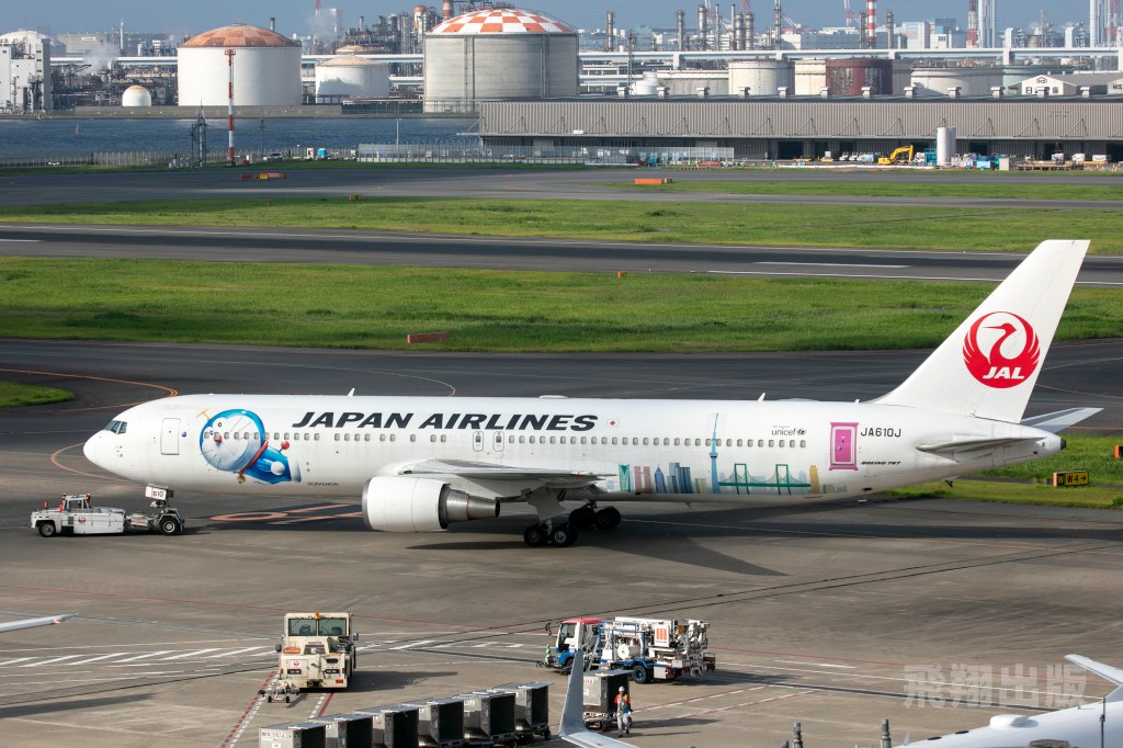 日本航空在註冊號JA610J的波音767-300ER客機繪上多啦A夢圖案,機頭左右兩側的多拉A夢頭戴著竹蜻蜓,伴隨旅客一同飛上籃天;在機身後端繪製出東京晴空塔、台場彩紅大橋等東京著名景點;在機身後艙門更直接繪製成為「隨意門」。