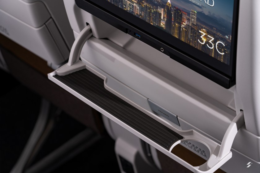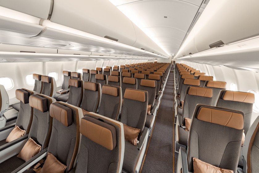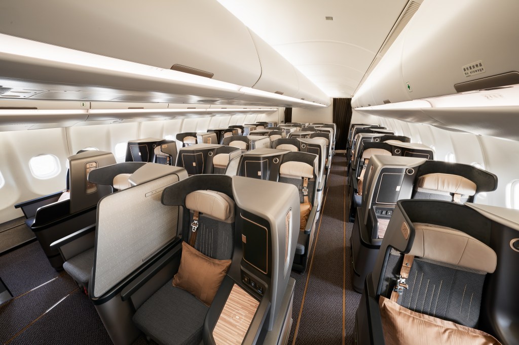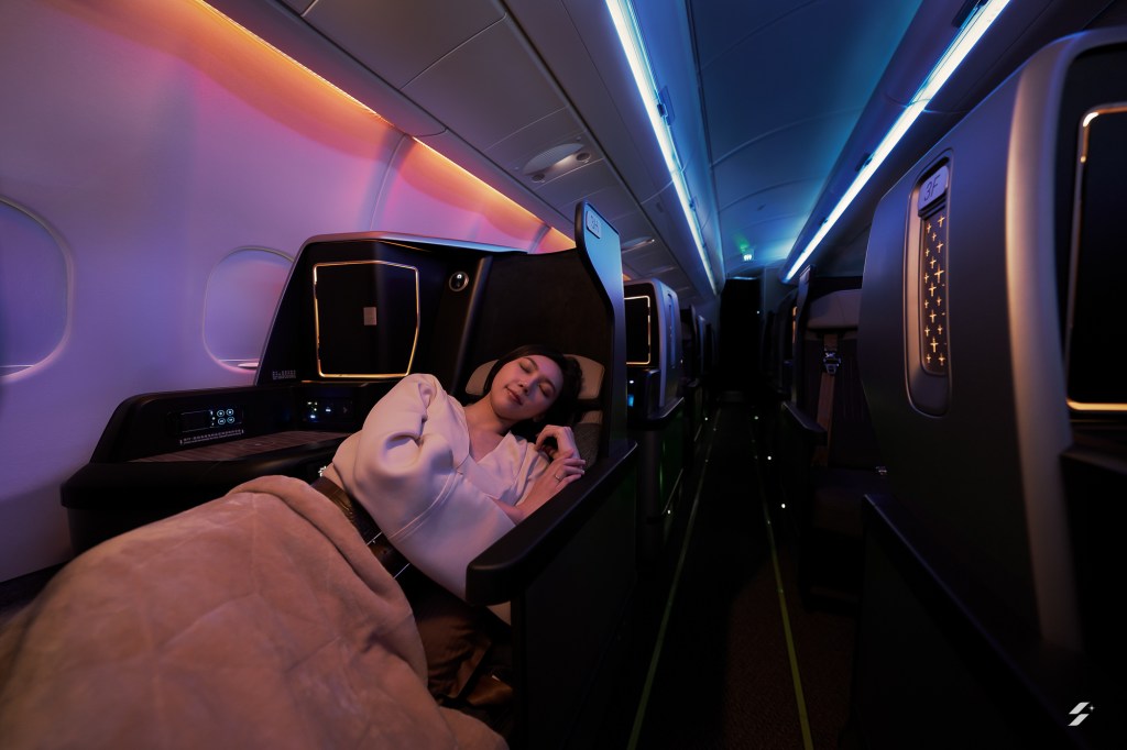 不同的情景燈光,營造最佳搭機氣氛,並有助調整時差。 為進一步提升私人空間,商務客艙採用 1-2-1 錯位式佈局,讓每位旅客皆享有獨立的走廊出入口,座椅之間更設有座椅板隔。經濟客艙方面,採用標準的 2-4-2 佈局, 採用德國 RECARO 製造的新型超薄座椅,以提升旅客的腿部空間。頭靠可進行調整,讓每位旅客皆可享受最佳的頭靠支撐。椅背則安裝平板電腦專屬立架,並設有杯架。 個人娛樂系統方面,商務艙配備 17.3 吋 4K 大螢幕,而經濟艙每位旅客也能享用 13.3 吋 4K 螢幕,全機支援藍芽無線音源傳輸,旅客可使用個人耳筒欣賞機上提供的精 彩影片及音樂等節目。