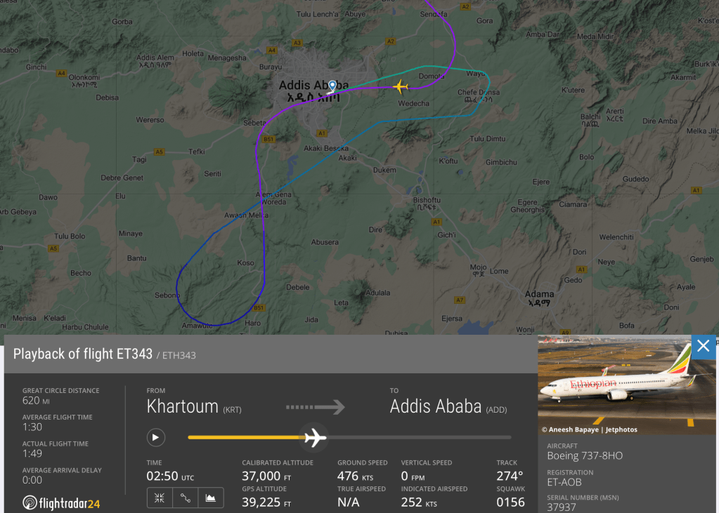 當地時間2022年8月15日凌晨3時,埃塞俄比亞航空註冊號ET-AOB的737-800客機執飛ET343航班時,飛機並沒有按照原定的下降程序,繼續在37000英尺高空巡航飛行。期間空中交通管制人員賞試與機上的機組人員取得聯系,但均未成功。直到客機在接近阿的斯阿貝巴時,飛機自動駕駛系統斷開並觸發警報,兩名睡著的飛行員才被警報聲音喚醒。