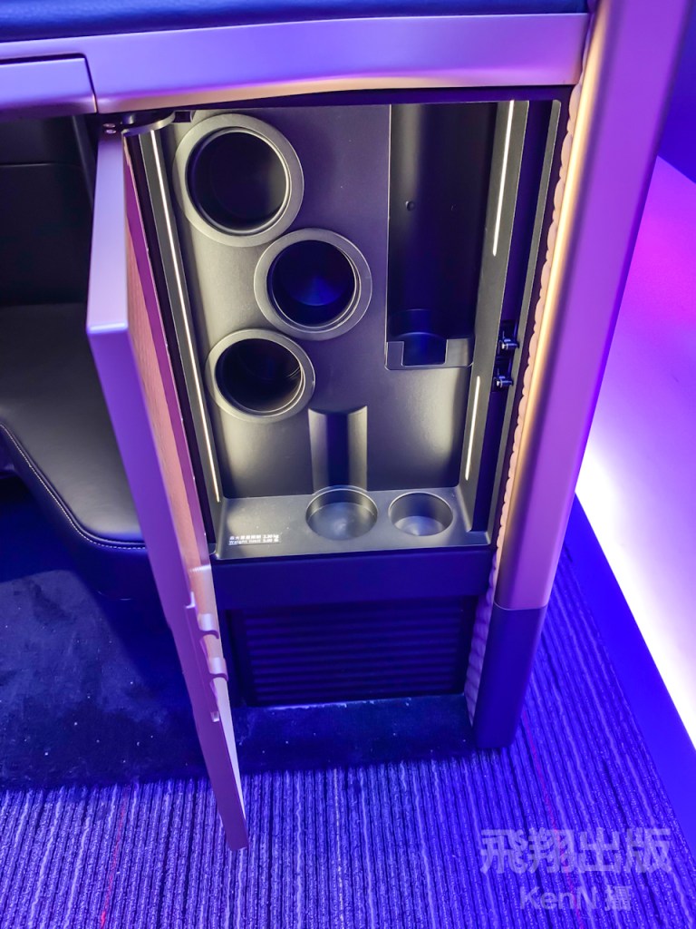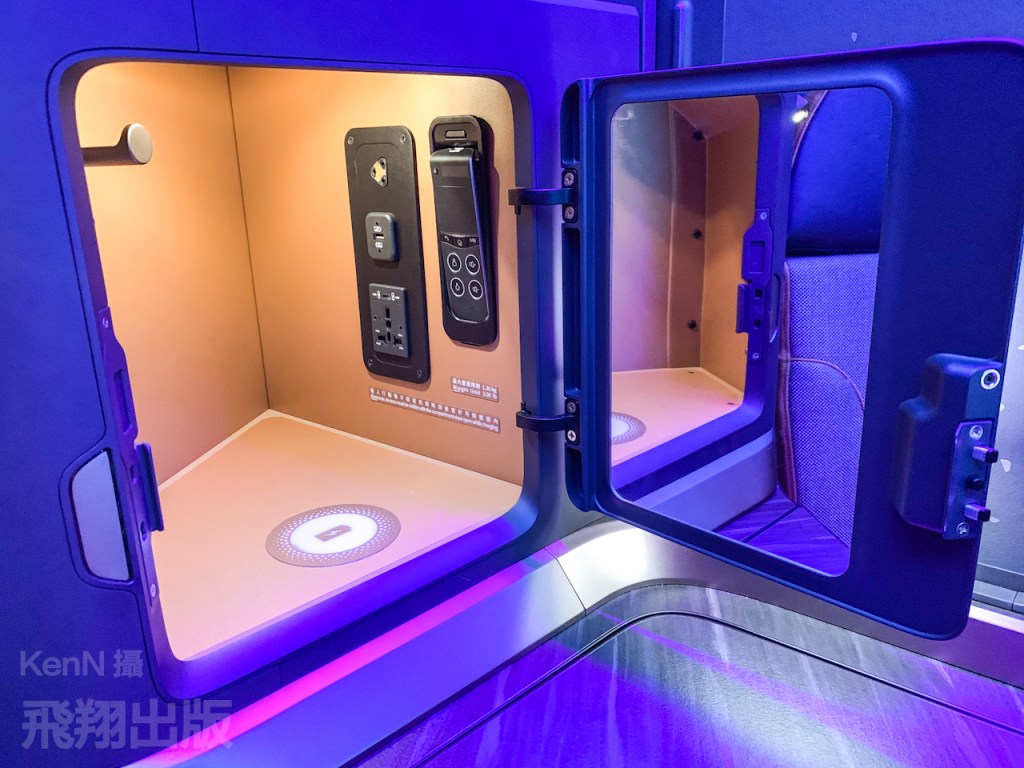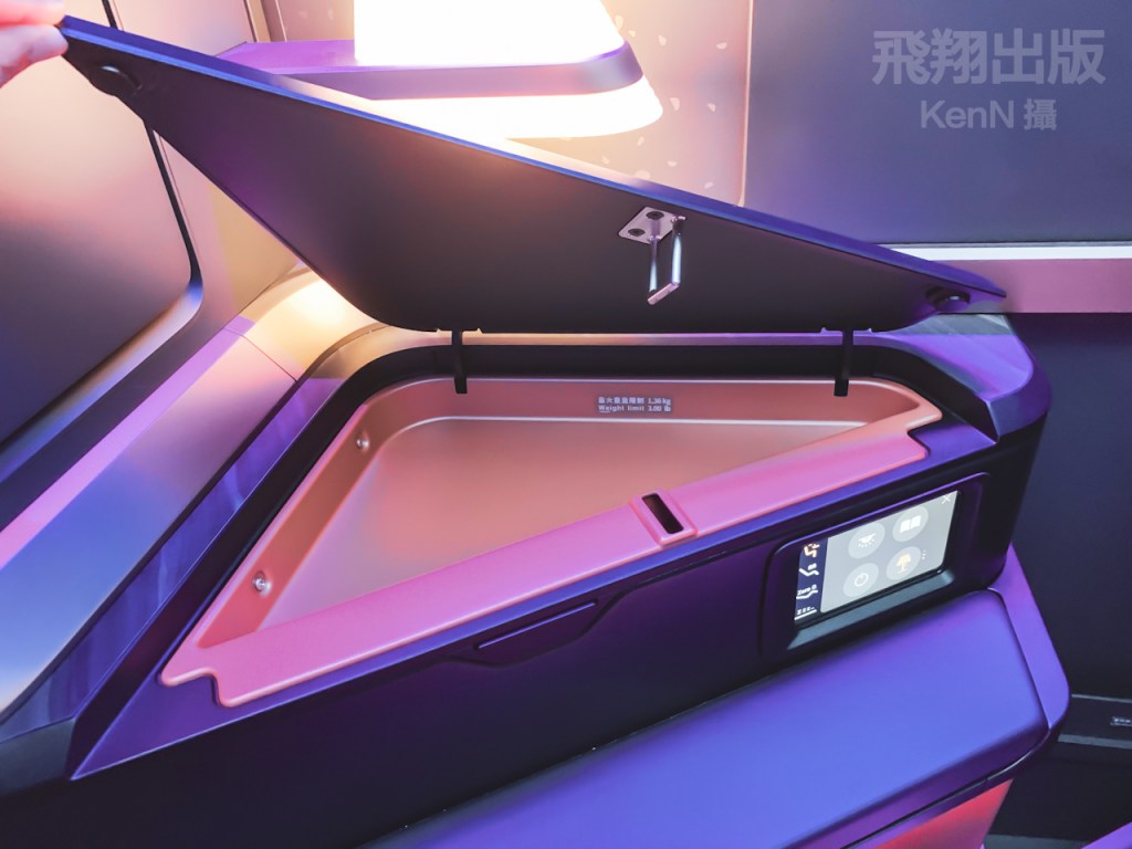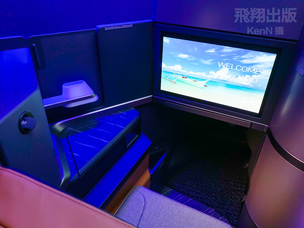 旅客可使用三段氣壓式按摩,並自由調整在座椅旁的氣氛檯燈,把座椅成為個人專屬的空間。在座椅上提供無線充電裝置、複合式插座、四向調整扶手,以及配置24吋4K大螢幕。<KenN攝>(按圖可放大)
