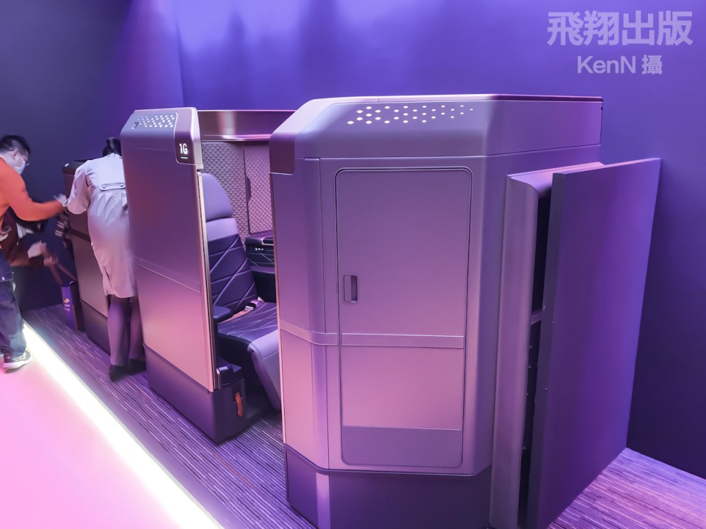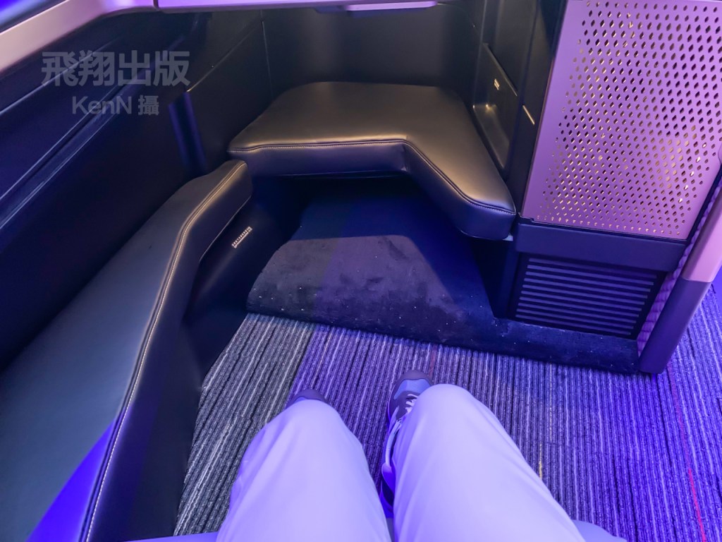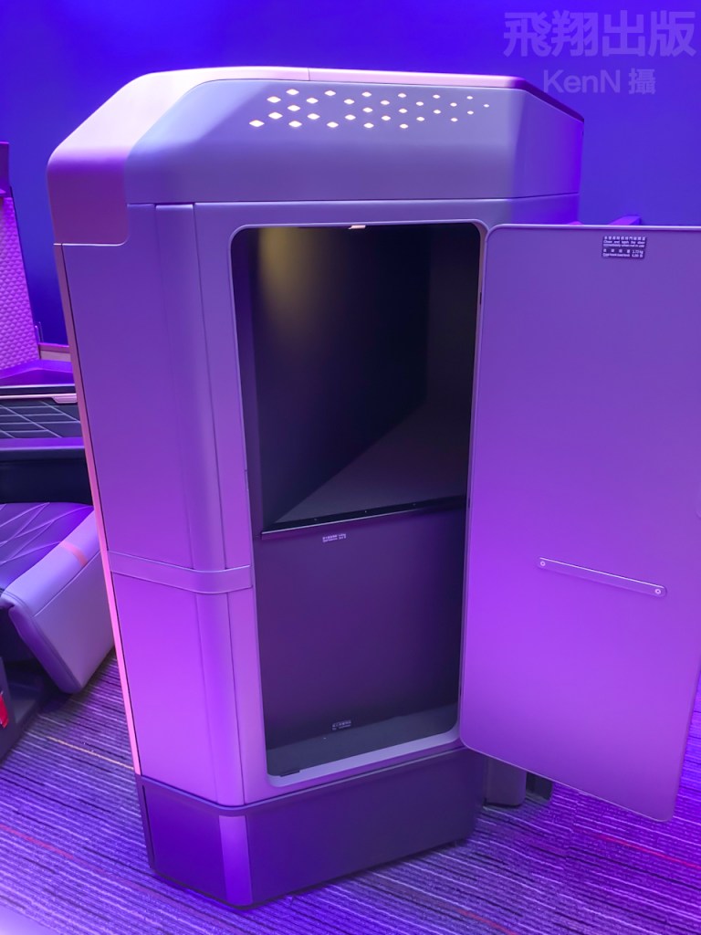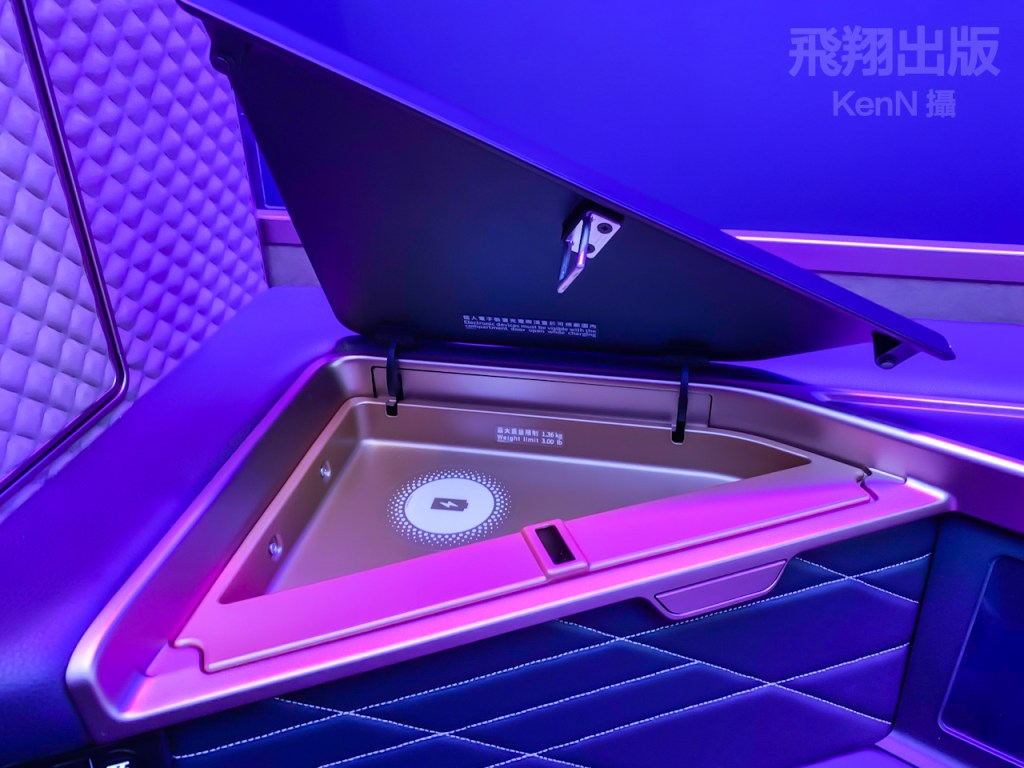 旅客可使用三段氣壓式按摩,並自由調整在座椅旁的氣氛檯燈,把座椅成為個人專屬的空間。在座椅上提供無線充電裝置、複合式插座、四向調整扶手,以及配置24吋4K大螢幕。<KenN攝>(按圖可放大)